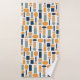 Dieses Handtuch-Set hat ein Badehandtuch mit einem modernen Design aus Ovalen und Rechtecken in Motiven, die sich im Design wiederholen, ein goldenes Waschlappen und ein blaues Handtuch.
