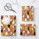 Papier in einem spielerischen Muster aus stilisierten Katzen in warmen Ingwer-, Creme-, Schwarz- und Brauntönen auf karamellbraunem Hintergrund. Jede Katze hat ihren niedlichen Ausdruck und ihre Markierungen, mit kleinen Pfotendrucken, die überall verstreut sind.