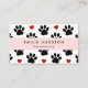 Niedliche, lustige und bezaubernde Visitenkarten mit schwarzen Pfoten und roten Herzen. Modernes Design, perfekt für Hundetrainer, Hundegroßhändler, Hundeschuhler, Haustierer, Tierhändler und Tierärzte.