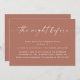 Mit dieser Probe-Dinner-Einladung in Mute Clay laden Sie Ihre Gäste mit schlichter Eleganz ein - ein warmer, erdbrauner Ton, der an Wüstensonnenuntergänge und natürliche Terrakotta erinnert. Dieses Design mit dem Satz "The Night Before" in knalligem weißen Schriftzeichen verbindet modernen Minimalismus mit rustikalem Charme. Dieses vielseitige Design eignet sich ideal für Hochzeiten im Herbst, Spätsommer-Feste oder Boho-Chic-Events mit erdigen Farbpaletten. Egal ob Sie eine Ansammlung im Hinterhof, ein Weingarten-Dinner oder eine gemütliche Herbst-Probe beherbergen, diese Einladung Set den Ton. Als digitaler Download zum bequemen Zuhause-Druck oder zur Verwendung mit Ihrem bevorzugten Druckservice.