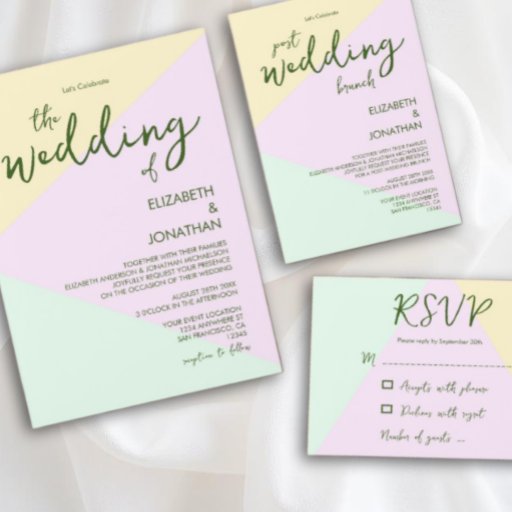 Hochzeitskollektion mit gedämpfter Pastellminze, gelbem und lila Hintergrund mit olivgrünem Text