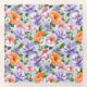 Muted watercolor style flower pattern of pink, orange, lavender flowers with green leaves on a mint background.