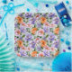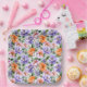 Muted watercolor style flower pattern of pink, orange, lavender flowers with green leaves on a mint background.