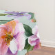 Muted watercolor style flower pattern of pink, orange, lavender flowers with green leaves on a mint background.