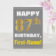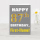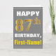 Dieses mögen einfache Geburtstag-themenorientierte Grußkarten-Ausrüstungsbeschreibungen ein warmer Geburtstagswunsch "GLÜCKLICHEN 87. GEBURTSTAG, Erst-Namen!" auf der Front im mutigen Text auf einem grauen (grauen) farbigen Hintergrund. Die Geburtstagszahl hat Imitat/nachgemachten Gold ähnlichen Farbtonauftritt. Der Name auf der Front kann personalisiert sein. Die inneren Eigenschaften eine kundengerechte Geburtstagsmitteilung. Eine Grußkarte so könnte eine Spaßweise sein, Geburtstagswünsche an jemand zu liefern, das ihren Geburtstag des Siebtels achtzig feiert. [~Z0000283]