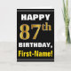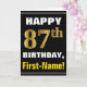 Dieses mögen einfache Geburtstag-themenorientierte Grußkarten-Ausrüstungsbeschreibungen ein warmer Geburtstagswunsch "GLÜCKLICHEN 87. GEBURTSTAG, Erst-Namen!" auf der Front im mutigen Text auf einem Schwarzen färbte Hintergrund. Die Geburtstagszahl hat Imitat/nachgemachten Gold ähnlichen Farbtonauftritt. Der Name auf der Front kann personalisiert sein. Die inneren Eigenschaften eine kundengerechte Geburtstagsmitteilung. Eine Grußkarte so könnte eine Spaßweise sein, Geburtstagswünsche an jemand zu liefern, das ihren Geburtstag des Siebtels achtzig feiert. [~Z0000275]