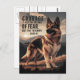 Ein deutscher Schäferhund steht hoch und stolz vor dem Hintergrund eines Sonnenuntergangs in den Bergen. Der Zitat Courage ist nicht die Abwesenheit von Angst, aber der Triumph darüber wird über dem Hund angezeigt.