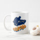 Die Tasse zeigt einen mutigen Skater, der in Blau und Orange springt.