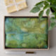 Gelegentliche Tropfen und Wirbel in den hellen Farben von Blauem und von Grünem, geschaffen von einer oeiginal Alkohol-Tintenmalerei.