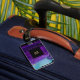 Dieser moderne Gepäckumbau kennzeichnet ein klares lila und blaues Watercolorspritzen auf einem schwarzen Hintergrund, mit Imitatgoldblickakzenten.