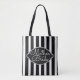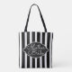 Moderne Brautmütter-Hochzeitsfeier personalisiert Tote-Tasche - Moderner Schwarz-Weiß Streifen Hintergrund. Im Mittelpunkt steht "Mutter der Braut" in eleganter, weißer Schrift. In einer trendigen, Imitat-Tafel mit Imitaten silbernen Glitzer-Kanten dargestellt. Zurück ist identisch. Machen Sie personalisiert Hochzeitstaschen für jedes Mitglied Ihres Brautparty! Oder Junggeselinnen-Abschied-Accessoires. Entspricht modernen Hochzeiten, Schwarz-Weiß-Hochzeitsfarben und Silberhochzeiten. Einfach und elegant, wenn Sie nicht alle vier Designs mögen.