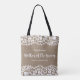 Die Mutter des Bräutigams wird diese wunderschöne personalisierte Totttasche mit einem rustikalen Spitzen-Set vor einem Imitat-Rutsche Hintergrund Liebe geben. Fügen Sie den Namen der Mutter des Bräutigams und den benutzerdefinierten Text hinzu, um ihn zu personalisieren. Ideal für Hochzeitsreisen wie Make-up, Schuhe, Kleidung und vieles mehr. Arbeitet gut für rustikale oder ländlich schicke Scheunenhochzeiten.