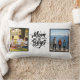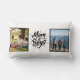 Dieses dekorative Kissen für den Lendenbereich zeigt einen anspruchsvollen Schriftzug "Mom of Boys" in Pinseloptik, der von zwei großen, anpassbaren Fotopaneelen flankiert wird. Die längliche Form des Kissens ist darauf ausgelegt, den unteren Rücken zu stützen und gleichzeitig als prominente Präsentation für Familienfotos zu dienen.