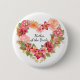 Blumenkranz "Mutter der Braut"-Knopf. Rosa und rote Aquarellfarben auf einem wunderschönen Blumenkranz. Fügen Sie Ihren Text mit den angegebenen Leerzeichen hinzu. Verwenden Sie die Schaltfläche Anpassen, um Schriftart, Schriftart, Farbe oder Position anzupassen.