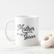 Eine Mutter der Groom Hochzeitsfeier Tasse mit einem minimalistisch einfachen Kalligraphieskript-Schriftart. Als Geschenk für die Mutter des Himmels für knechte Hochzeiten, Zelthochzeiten, Hochzeiten im Herbst, Hochzeiten im Freien und Waldhochzeiten.