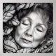 Eine von der KI generierte digitale Schwarz-Weiß-Illustration zeigt ein Portrait einer wunderschön detaillierten schlafenden alten Frau, umgeben von Blätter