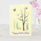 Diese Muttertagskarte erzeugt eine farbenfrohe, skurrile Frühlingsstimmung. Vögel fliegen und stehen im Baum. Schmetterlinge schweben in der warmen Luft. Eine Ente wadelt im Gras. Es gibt sogar eine winzige Schnecke auf dem Boden. Das Bild wird innen wiederholt. Alle Texte können auf Ihre Bedürfnisse angepasst werden.