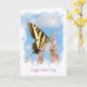 Eine wunderschöne Karte eines Frack-Schmetterlings auf einer Feder blüht. In einer künstlerisch-malerischen Art gemacht. Wunderbare Komplimente an der Innenseite für diese besondere Person am Muttertag.