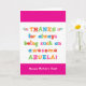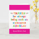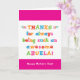 Sie nennen Ihre Großmutter Abuela, nicht Oma. (Abuela bedeutet Großmutter auf Spanisch.) Stellen Sie sich vor, wie aufgeregt Abuela sein wird, eine Muttertagskarte zu erhalten, die speziell an sie adressiert ist! Ihre Abuela wird auch Liebe dieser Karte lustige, farbenfrohe Text-basierte Design, dass "Danke für immer ein so phantastisch Abuela! Alles Gute zum Muttertag!" Machen Sie diese Karte anpassbar! Klicken Sie auf "Design bearbeiten", "Unten/Rechts: Text & Bilder", "Text" und "Text hinzufügen", um Ihre eigene, personalisierte Nachricht an Abuela drinnen zu schreiben!