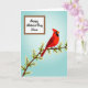 Diese Karte zeigt einen leuchtend roten Singvogel, der auf einem braunen Ast sitzt, der quer durch die untere Mitte verläuft, umgeben von kleinen weißen Blüten mit gelben Zentren, die sich wie ein sanftes Geschenk anfühlen ❤️. Die dunkle Gesichtszeichnung und das wachsamen Auge des Vogels sorgen für Kontrast, als ob er innehalten würde, um jemanden in der Nähe in einem stillen, liebevollen Moment zu bewundern. Ein sanfter blauer Farbverlauf füllt den Hintergrund aus und gibt der Szene offenen, luftigen Raum wie an einem ruhigen Frühlingmorgen. Im oberen linken Bereich enthält ein weißes rechteckiges Feld die Nachricht, ordentlich vom Vogel entfernt, sodass die Kunst das Auge weiterhin führt. Die Schrift ist fließend und elegant, in dunkler Tinte gedruckt, die sich deutlich vom weißen Feld abhebt. Die Balance zwischen den kühlen Himmelsfarben und den warmen roten Federn erzeugt ein zartes, freundliches Geg