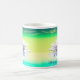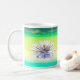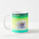 Kaffee Tasse für die Mama mit meinem Kunstwerk einer weißen Wasserlilie reflektiert auf dem Wasser in Grüntöne und gelb. Im Text steht "Muttertag glücklich sein".