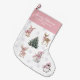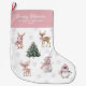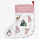 This sweet Christmas stocking features a watercolor collection of pink woodland animals including a bunny, deer, penguin, and snowman gathered around a festive Christmas tree. Personalized with your baby’s name and the year, this charming design makes a beautiful keepsake for her first Christmas. Perfect for nursery decor, holiday photos, or gifting, it brings a soft and joyful touch to your family’s festive celebration.