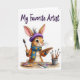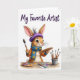 This design shows a long-eared bunny artist 🐰 centered on a white background, pausing mid-paint with a brush raised and a wooden palette in the other hand. The bunny’s soft fur, big brown eyes, and small smile feel like a tender glance shared with someone nearby, as if it’s painting with a friend in mind. It wears a purple beret with a light feather, an orange smock, and a blue scarf with dotted spots that add a cozy, artsy touch. Along the lower area, a pot holds several brushes standing upright, and another palette sits close by with small pools of bright, jewel-like paint. A few scattered paint splashes across the workspace suggest recent activity, like a cheerful studio moment 🌷. Near the top, the phrase “My Favorite Artist” is placed above the bunny in dark lettering that stands out clearly against the white space. The brush tip is coated in fresh color, and the palette shows multiple paint dabs arranged in a loose arc.
