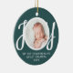 This keepsake "My First Christmas As Great Grandpa" photo ornament is decorated with the word JOY in white stylish script typography on a green background. Easily customizable, with your baby's photo.