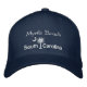Myrtle Beach, South Carolina mit einem Palmenmoon-Logo bestickt auf einem Hut. Wählen Sie Ihren Lieblings-Hutstil und Farbe und passen Sie den Namen der Stadt an. Sie können auch die Threadfarben des Palmetto-Mondes und des Textes anpassen.