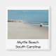 Vater und Tochter gehen Hand in Hand in der Küstenstadt Myrtle Beach. Myrtle Beach und die Pier sind im Hintergrund.