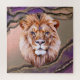 Ein majestätisches Löwengesicht ist mit leuchtend blauen Augen und einem dekorativen Juwel auf der Stirn dargestellt, Set vor einem Hintergrund wirbelnder Erdtöne. Der Löwenmane ist reich detailliert, was ein Gefühl von Gleichheit und Power schafft.