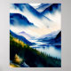 Schöne landschaftliche Aussicht auf einen mystischen See inmitten einer nordischen/skandinavischen Bergkette - Eine KI kreierte einen digitalen Aquarellkunstdruck.