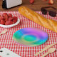 Farbige pastellfarbene ombre Jahrtausend radialer Farbverlauf. Rainbow pastellel Traumverlauf. Farbige Texturen, meditativ, holografisch, irisierend, rismatischer Regenbogen. Minimal modernes Design. Gute Geschenke.