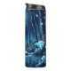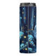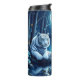 Dies ist eine mystische und ätherische Abbildung eines weißen Tigers, der nachts in einem magischen Wald ruht. Der Tiger mit seinen auffallenden blauen Augen liegt an einem stillen Gewässer, dessen Reflektion unten sichtbar ist. Der Wald besteht aus hohen, dunklen und gewundenen Bäumen, die von einem großen, leuchtenden Vollmond und glühenden Lichtern erhellt werden. Die blauen und weißen Pilze sprießen vom Boden her, was die zauberhafte Atmosphäre noch verstärkt.