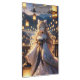 In diesem bezaubernden Reich steht eine Frau mit einem unverkennbaren Wesensgehalt anmutig auf einem großen Balkon. Ihre sicheren grünen Augen, groß und ausdrucksvoll, glänzen mit einer Mischung aus Weisheit und Neugier. Das perfekt ergänzt ihr fließendes goldenes Haar, gestylt mit scharfen, dynamischen Linien. Sie ist in einem aufwändigen Kleidungsstück gekleidet, das mit himmlischen Motiven geschmückt ist, die sowohl Launen als auch Reife widerspiegeln. Als sie lebt, entfaltet sich das Stadtbild der Dämmerung, mit ätherischen schwimmenden Laternen, die ein warmes Licht gegen die coole Dämmerung werfen. Dieses Portrayal erfasst die ruhige Schönheit und Tiefe des Charakters.