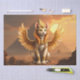 Mystical Winged Cat Sphinx - Ägyptische Fantasiekunst. Ein majestätischer Katzensphinx mit goldenen Flügeln liegt anmutig in einer Wüstenlandschaft, gerahmt von Pyramiden und einem strahlenden Sonnenuntergangshimmel. Dieser mystische Wächter, geschmückt mit altem ägyptischen Schmuck und einer königlichen Kopfbedeckung, strahlt Ruhe und göttlichen Power aus. Dieses Kunstwerk verbindet ägyptische Mythologie, Fantasie und feline Eleganz - perfekt für Katzenliebhaber, Mythologen und alle, die magische und spirituelle Kunst genießen.