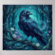 Dieses mystische Poster zeigt einen blauen Raben mit leuchtenden Augen, der in einem verzauberten mondbeschienenen Wald sitzt, umgeben von wirbelnder Magie, Blumen und verdrehten Bäumen. Fertiggestellt in einem malerischen Öl-Acryl-Stil.
