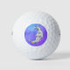 Dieser Golfball hat einen weißen mystischen Halbmond mit einem hübschen Gesicht und abstrakten Formen in lila, blau und gelb, gegen einen unscharfen lila Himmel.