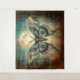 Eine große Motte mit komplizierten Mustern auf ihren Flügeln wird vor einem Hintergrund eines Vollmonds prominent dargestellt. Die Flügel der Motte sind vorwiegend aquamarin und grau mit rosa Farbtupfern, während der Mond blassgelb ist. Der Hintergrund weist ein wirbelndes Muster in gedämpften Grüntönen und Blues auf, das an einen Nachthimmel erinnert. Die Motte selbst hat mehrere Blicke auf ihren Flügeln und schafft so ein mystisches und faszinierendes Bild.