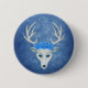 Dieser runde Button-Backknopf hat einen mystisch-weißen Hirschkopf mit großen Geweih-Geweihen, blauen Augen und drei blauen Rose auf dem Kopf auf einem Hintergrund schmiedeblauer Farbtöne.