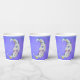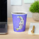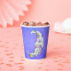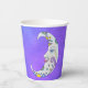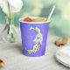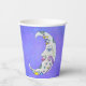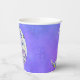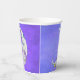 Diese Papiertassen haben einen mystischen, weißen Halbmond mit einem Gesicht. Der Mond hat rosa Lippen und blaue Augen und bunte abstrakte Markierungen in lila, gelb und blau auf einem lila Himmelshintergrund.