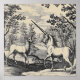 Mythisches Einhorn-Treffen mit einem Hirsch im Wald, herausgegeben im Buch des Lambspring, gefüllt mit allegorischen Bildern aus dem Mittelalter, die die Destillation und Extraktion von reinem Gold aus unedlen Metallen in einem Alchimielabor zeigen.