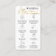 Stellen Sie sicher, dass Ihre Kunden mit dieser Wachskarte für die Pflege ihrer Haut mit den Goldfolieneffekten der Imitate vertraut sind. Diese Pflegeanleitung enthält Symbole für jeden Schritt, einen goldenen Script-Schriftart und Platz für Ihr Logo. Dieses White & Gold Beauty Guide Design ist perfekt, um Ihren Kunden nach einem Bikini, Bein oder einer anderen Art von Wachsbehandlung zu geben.