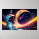Eine futuristische Szene zeigt einen Astronauten, der inmitten lebendiger, beleuchteter Stadtstrukturen unter einem Himmel stehend ist, der von einem großen, leuchtenden Mond beherrscht wird. Der Reflektor des Anzugs fügt eine geheimnisvolle und abenteuerliche Aura hinzu.