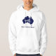 Eine schlichte weiße Silhouette eines Hundeschlittens und das Südkreuz überlagerten sich auf einer blauen Karte Australiens. Alles auf einem Hintergrund mit Sternen. Wer hätte es denn gehabt? Auf den Kopf in Oz. Hundeschlitten ist in Australien sehr beliebt. Auf dem Hotham in Victoria gibt es jedes Jahr ein großes Rennen.