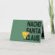 Ein Tortilla-Chip-Typ in einem zaghaften Santa Anzug sagt, er ist Nacho Santa Claus auf der Titelseite dieses käsespezifischen Gruß, mit Ihrem Käsegengesicht innen. Gute Ferien für Sie.