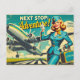 Hier ist die Vintage Reise Postkarte mit einem glamourösen Flugbegleiter aus den 60er Jahren mit einer stilvollen blauen Uniform, passendem Hut und weißen Handschuhen. ✈️ 🌍 👩 ✈️ sie hält eine Tragetasche und Gesten in Richtung eines schlanken Flugzeugs. Der Hintergrund ist ein klarer, blauer Himmel mit flauschigen Wolken und einer Start- und Landebahn. Die kühne Typografie im Stil der 1960er Jahre lautet "Nächster Halt: Abenteuer!" und verleiht ihr ein nostalgisches, von der Luftfahrt inspiriertes Ambiente.