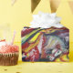 Elegantes, skurriles, künstlerisches Gemälde mit zauberhafter, farbenfroher Musik, Mond, Feen, Pferden in lebhaften, aquamarin-blauen, roten, gelben, weißen Farbtönen .Akrylmalerei auf Leinwand, Mischmedienmalerei mit goldener und silberner Folie .