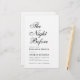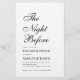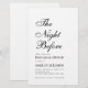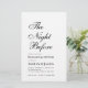 Ein einfaches, minimalistisches Dinner mit schwarz-weißer Probe. Es hat nur schwarzen Text auf weißem Hintergrund. Der Titel "The Night Before" ist in eleganter Kalligraphie geschrieben, der Anlass "Probe Dinner" und der Name sind in größeren Kaps geschrieben, die Erholung in kleinen Kaps. Der Text ist verlassen ausgerichtet.
