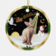 Eine farbenfrohe Sphynx-Katze beobachtet, wie der Weihnachtsmann und seine Rentiere in den Nachthimmel abheben, als eine Taube Frieden über dem Kopf schwingt.